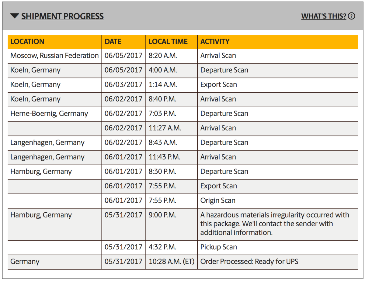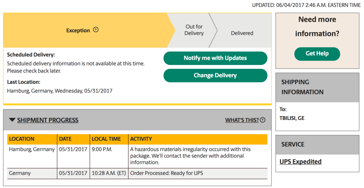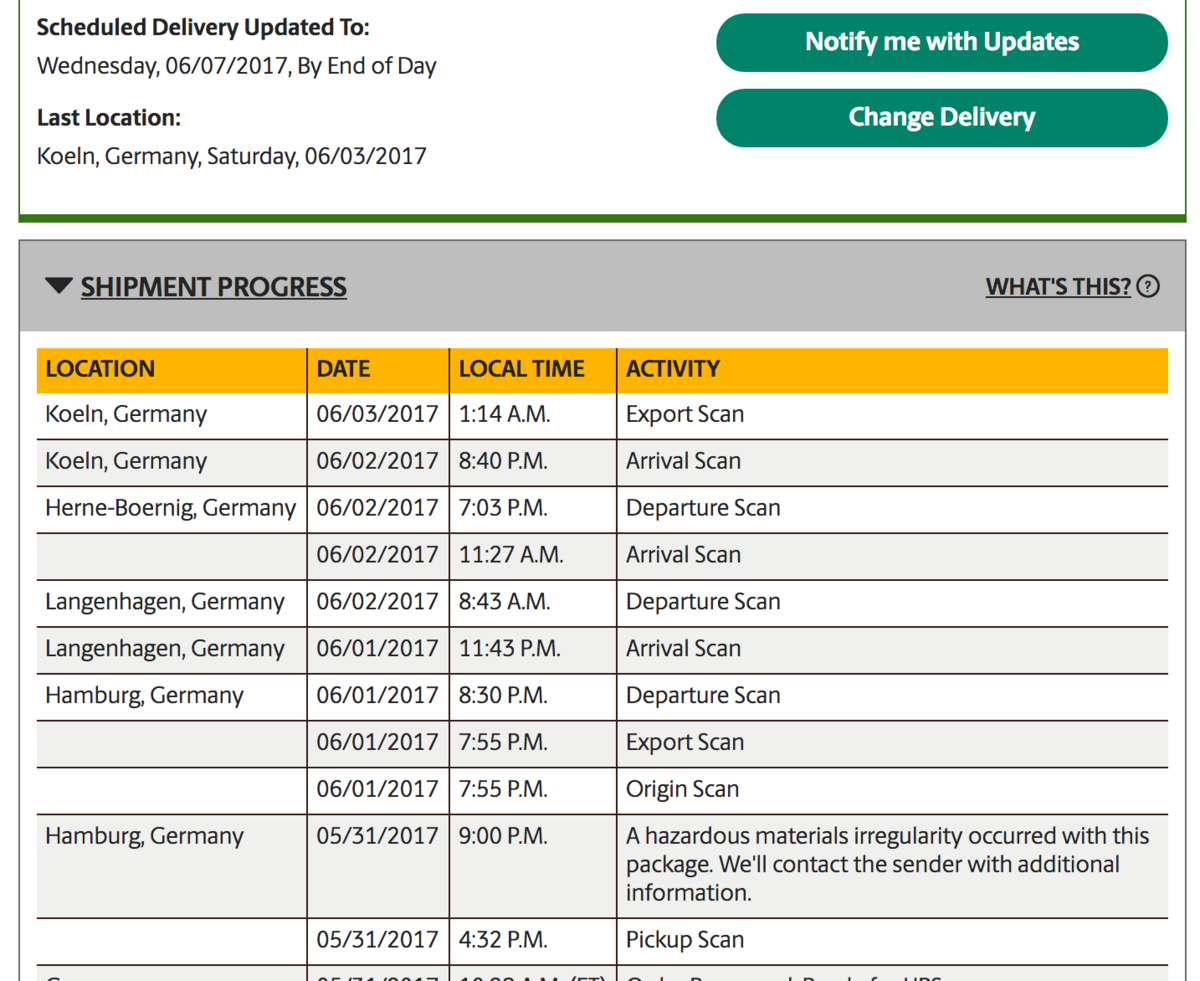 Waking up there was already a message of Dan waiting for me. The UPS tracking system says, the shipping has been stopped at 9:00pm. The comment in the tracking system: "A hazardous materials irregularity occurred with this package. We'll contact the sender with additional information."