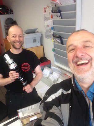 All the time I was in contact with Dan via FB chat/messenger. Dan suggested to search a shock of another brand. I asked Ingo about it and he told me, I may ask Thomas Harms from TWOWHEEL. "Thomas sometimes can perform magic", he said to me. I already did know TWOWHEEL and was immediately riding directly to their place. Wednesday they usually have closed for customers and don't answer phone calls. Wednesday is just a day in the garage for them.