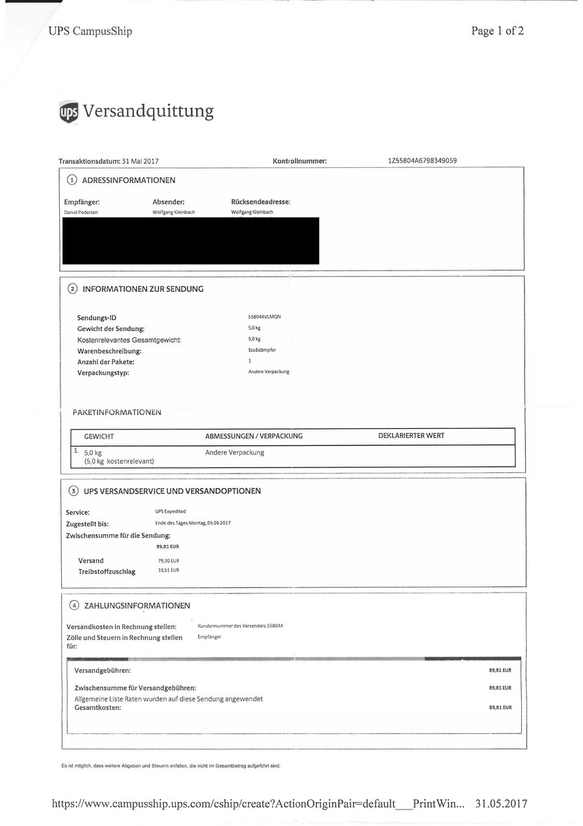 Back to UPS. Before I can order a new shock, I need the confirmation that I will get back the shock I've sent with UPS. If UPS will proceed in shipping the shock to Georgia, I would take a 600-700 Euro risk with buying and shipping another shock.