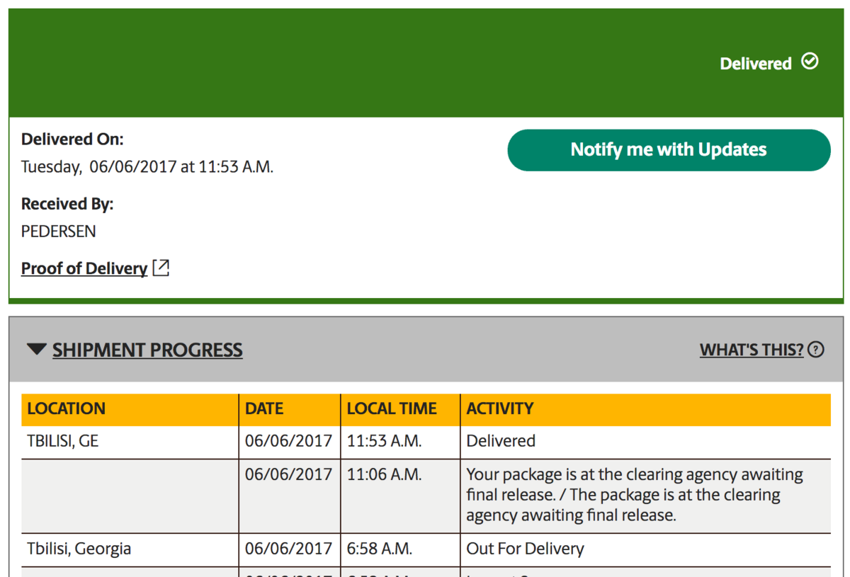 Happy to see the shock has arrived at UPS in Tbilisi. Fingers crossed it will be delivered today.